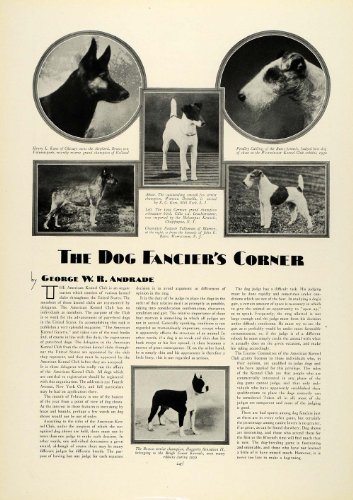 This is an original 1930 one-page article (one single-sided page) by George W. R. Andrade on various champion dogs, including the German Shepherd Bruno von Valunaspark, owned by Henry L. Kane of Chicago; Pendley Calling of the Bates kennels, judged best dog of show at the Westminster Kennel Club; the fox terrier Watteau Donzella, owned by E. C. Kem of Mill Neck, Long Island; the 1929 German Grand Champion Schnauzer Cilla v. d. Leuchtertanne, imported by the Melampus Kennels of Chappaqua, New York; the Airedale terrier Nedwob Tallyman of Blarney of the kennels of John G. Bates in Morristown, New Jersey and the Boston terrier Haggerty Sensation II, owned by the Reigh Count Kennels.