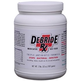 Debride RX Medicated Koi Food is a triple antibiotic medicated food that fish will actually eat.If you are not comfortable injecting your fish or can not locate antibiotics, or simply can not catch your fish, the Debride RX can help. Now you can give that ulcer problem the 1-2 punch!Debride RX is a sinking food.When used in conjuction with Debride Medicated Ointment fish really heal quickly. Available in a 2 pound jug and a 5 pound jug2 lb.. Debride RX Medicated Koi Food - Antibiotic Fish Food